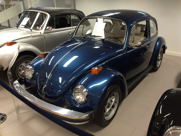 This example, in Bahama Blue Metallic with White vinyl, is museum quality and completely original. It has never been sold to a retail customer and has only 324 miles on the odometer. The sunroof on this car is a particularly desirable option. This car, shipped to our store, was our last Beetle Sedan and has resided in the museum ever since.